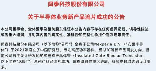 亲爱的读者们,你是否对科技行业的新动态充满好奇?今天,我要带你揭开闻泰科技最新爆料的神秘面纱。闻泰科技,这家在半导体领域崭露头角的企业,最近又有哪些新动作呢?让我们一起来看看吧!